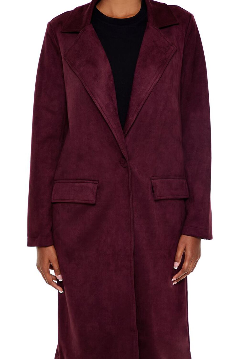 Crafted from high-quality faux suede, this longline trench coat in a rich merlot hue offers a luxurious look with a fraction of the cost. Its sleek longline silhouette and classic trench details make it a versatile piece, perfect for both casual and formal occasions. Stay stylish and comfortable this season with this must-have addition to your wardrobe.